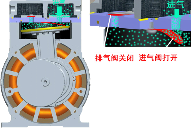 定子進(jìn)排出口分離開(kāi)來(lái),周而復(fù)始運(yùn)轉(zhuǎn),進(jìn)行變?nèi)荩瑢⑽霘怏w,從排氣口排出,從而達(dá)到抽氣目的。