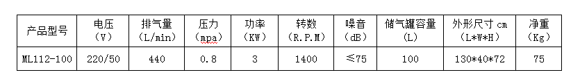臺冠空氣壓縮機,簡稱空壓機,是工業現代化的產物,ML112-100壓縮機用途非常廣泛,主要表現在用于輪胎充氣、噴漆、潛艇沉浮、沉船打撈、海底石油勘探、氣墊船、食品、制藥工業,利用壓縮空氣攪拌漿液、高壓空氣爆破采煤等等。